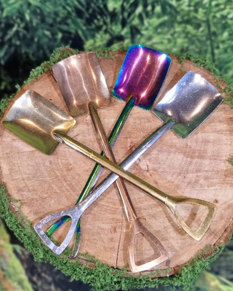 A quirky metal spade spoon for layering fizz and florals into potions. A whimsical, reusable tool made for magical play.